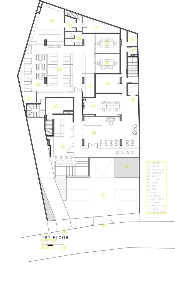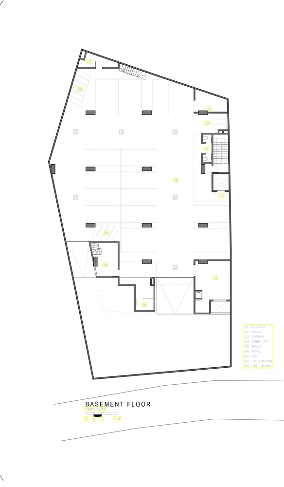 As the existing site is further under the main road, this area is used as a basement parking zone with little stockpiling work on site. The basement also serves as the building's service room. Meanwhile, the first floor of the basement functions as the main lobby, adjacent to the back office house and commercial area.