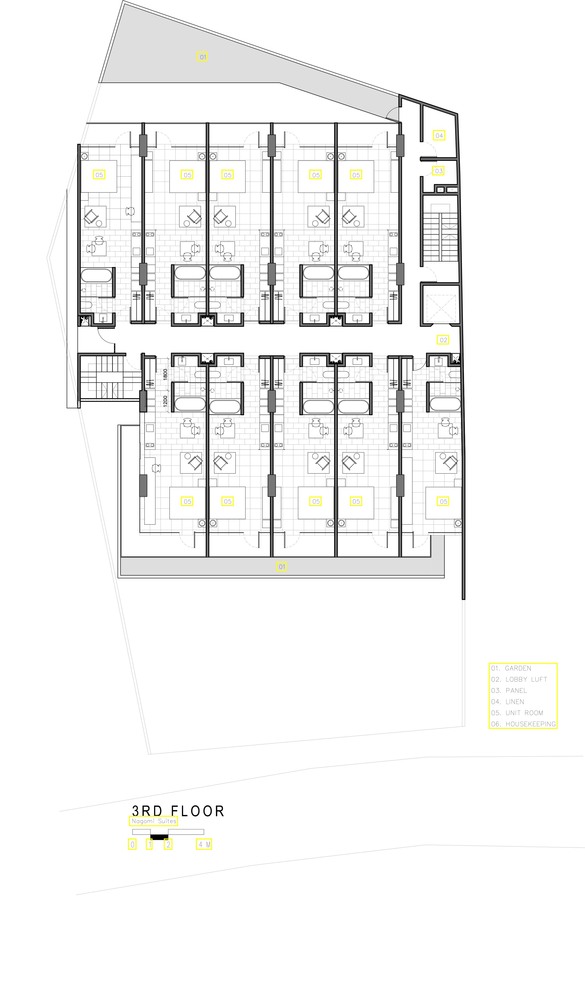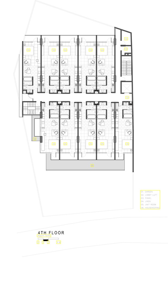 Consisting of 40 suites, each room has an area of 40.5 square meters. With this area, this room is sufficient for facilities such as a private pantry, dining room, bathroom with bathtub, and private garden. The top floor is used as a penthouse with one master bedroom, one bedroom, living room, dining room, and also a large roof terrace garden.