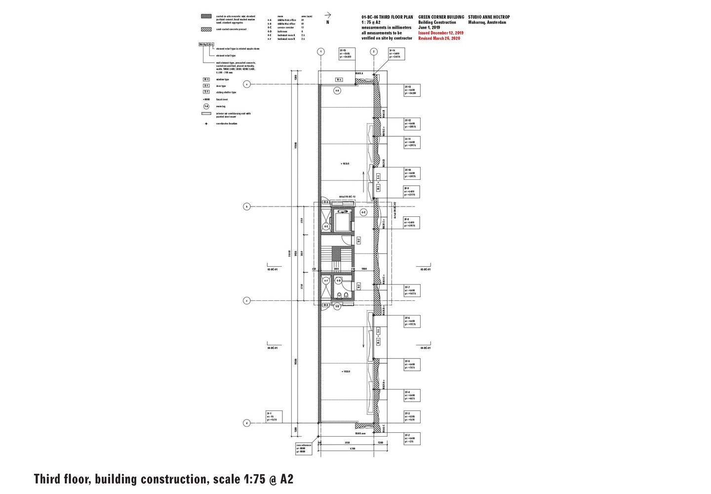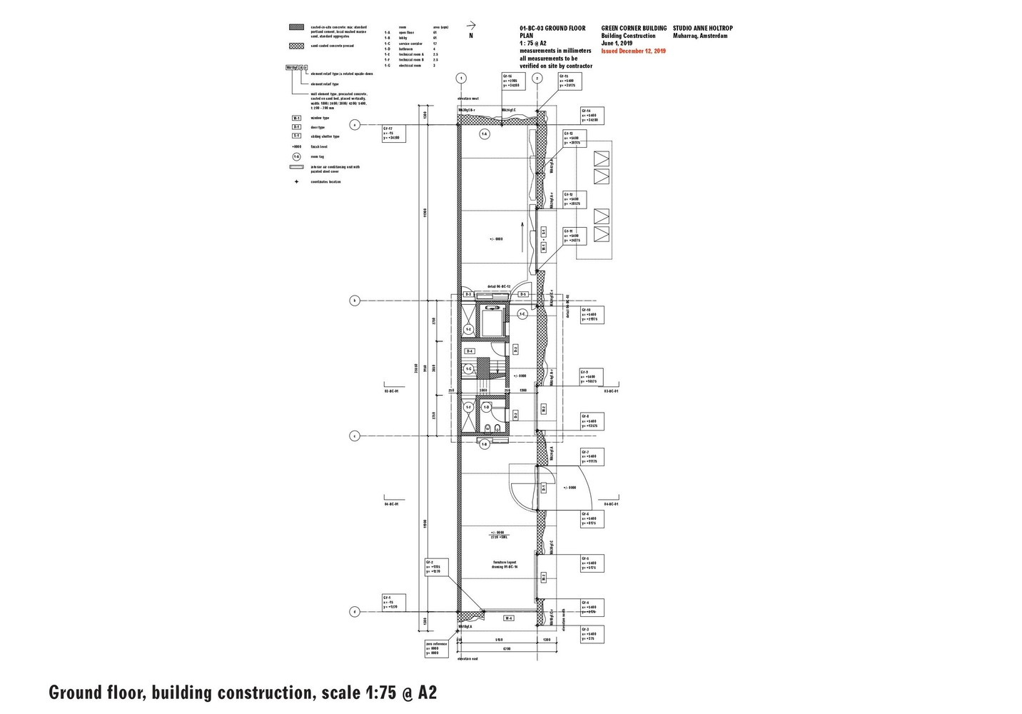 The unique concrete facade is made of structural wall elements that are cast with a mixture of sand. In the interior, the walls apply a unique textured concrete found in the corners building and at the window position.