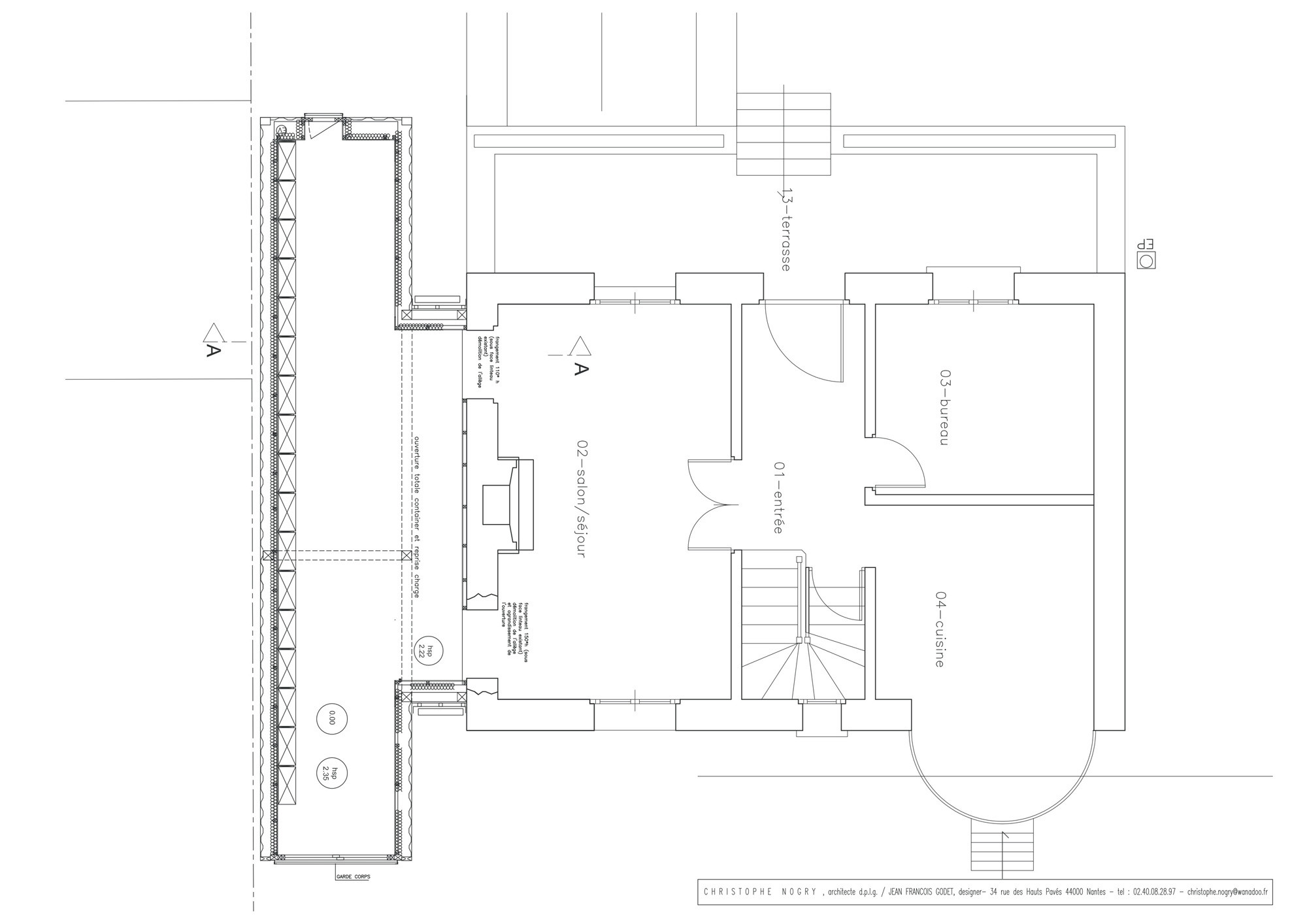 Nogry began this residential expansion by uniting the mass of the main building and two new volumes by dismantling one of the house's walls and containers. Then he installed a wooden frame plug-in between the two entities, resulting in architectural coherence that matched the design drawings.