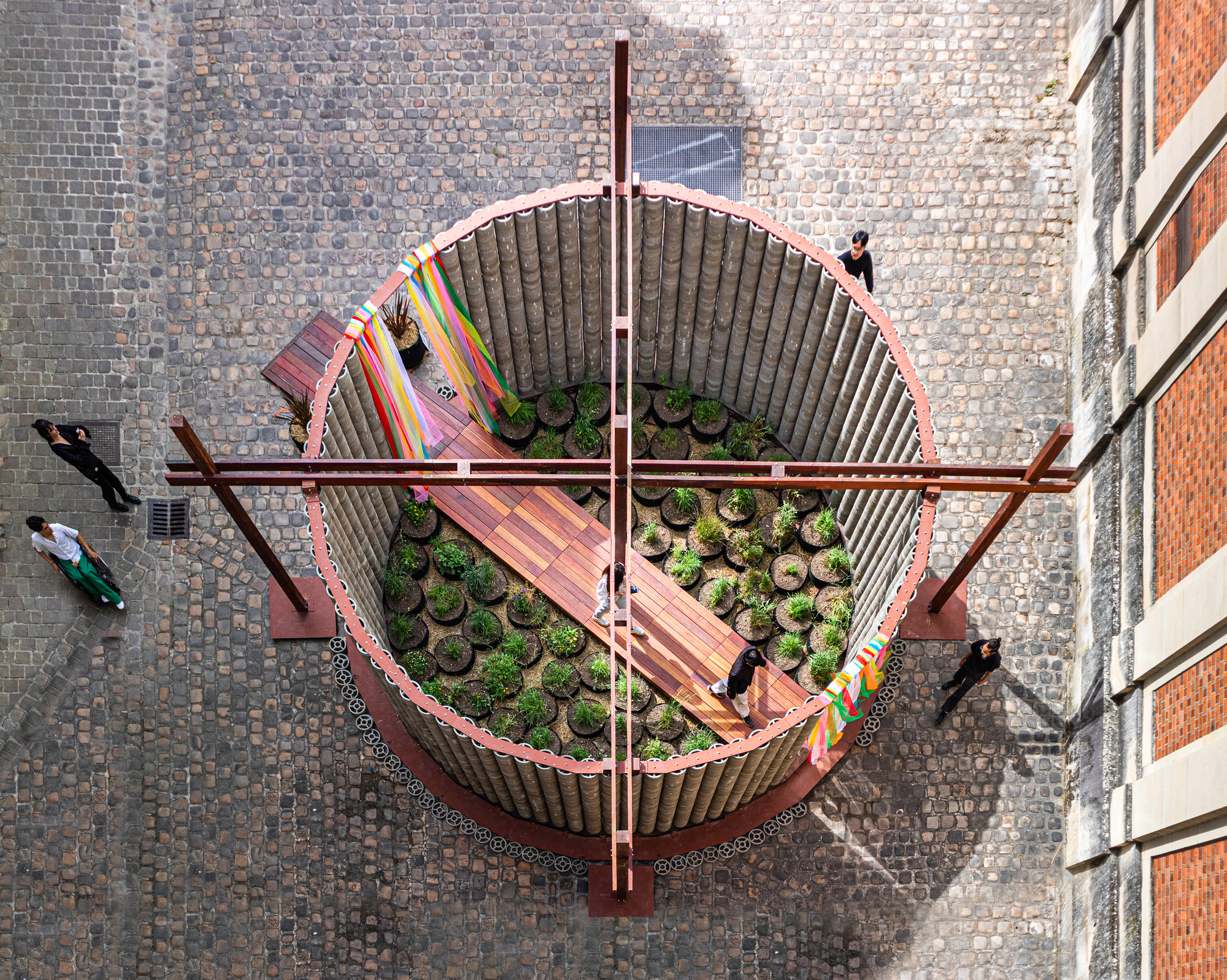 The circular building is made of steel pole structures with piles of bricks arranged to form a closed space without a roof. Upon entering the pavilion, visitors will be greeted with colorful fabrics waving at the entrance from the pavilion. Inside there is a path that is the visitor's access to see the space inside the pavilion. In addition, there is also a small garden that opens up to the sky, sunlight, and air expressing the stunning elegance of nature.