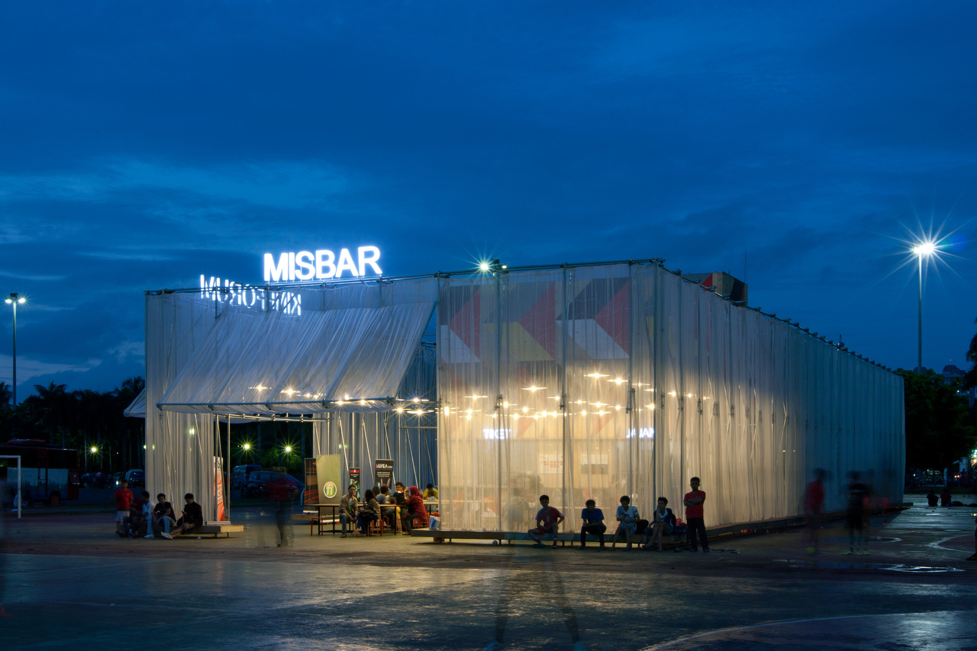 For example, the use of fabric partitions separating outdoor and indoor areas has been practiced by architectural studios Csutoras and Liando in designing Kineforum Misbar, a temporary installation promoting Indonesian films. In designing this temporary cinema, they used a semi-transparent agronet cloth as a partition as well as to strengthen the character of the building. As a result, Kineforum Misbar can look beautiful using a semi-transparent fabric that makes this installation glow like a lantern that lights up at night.